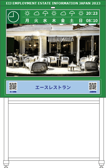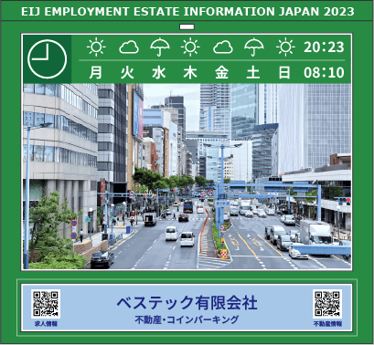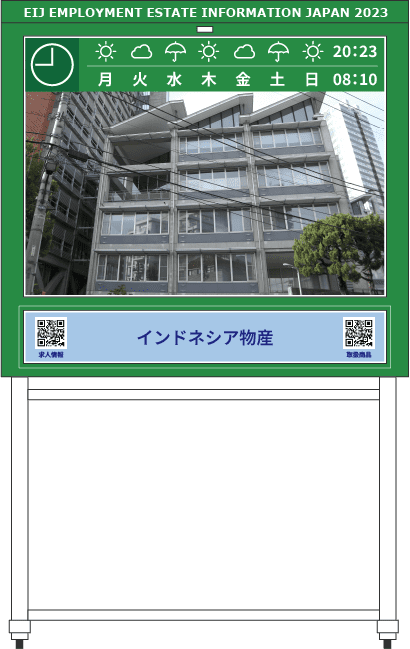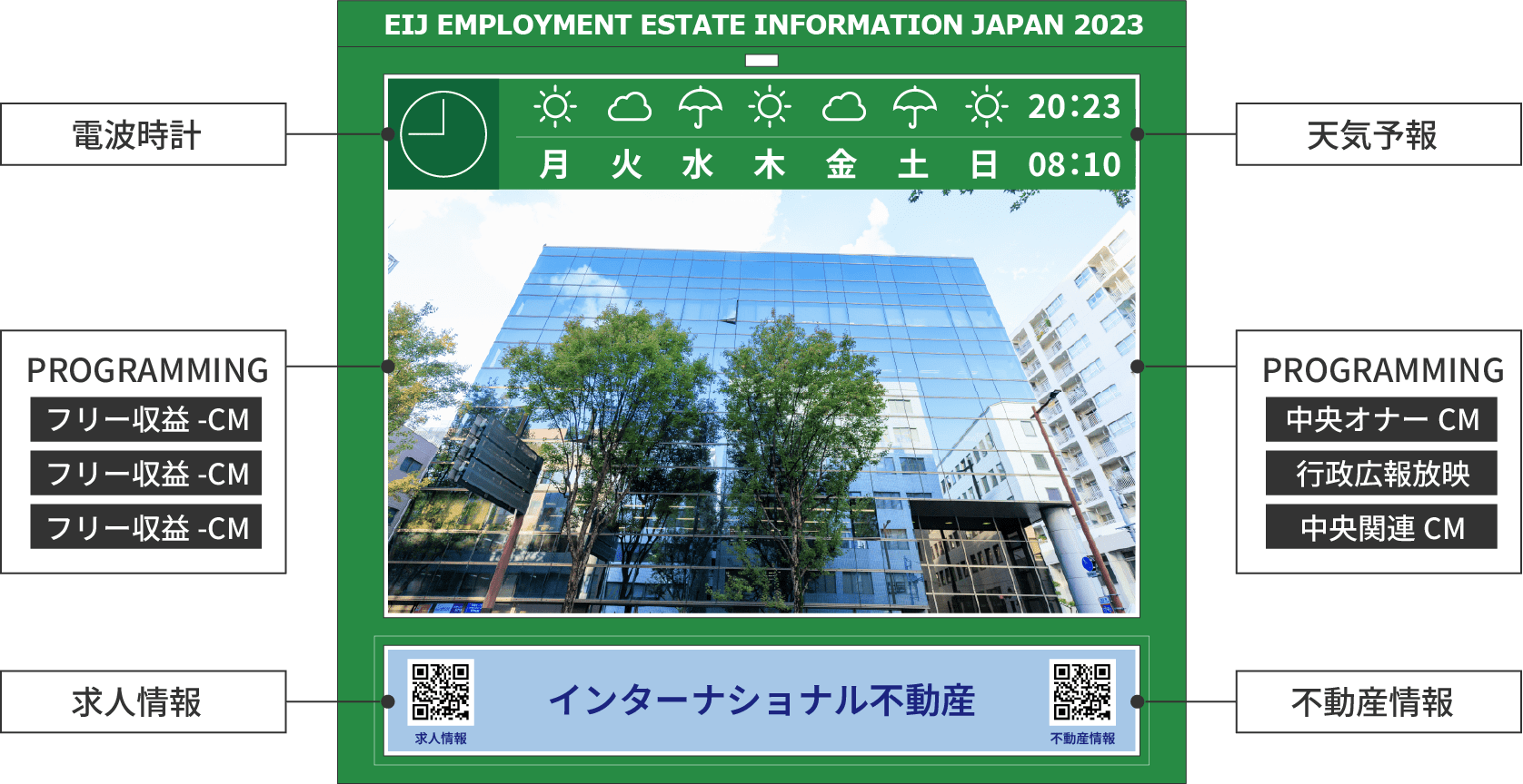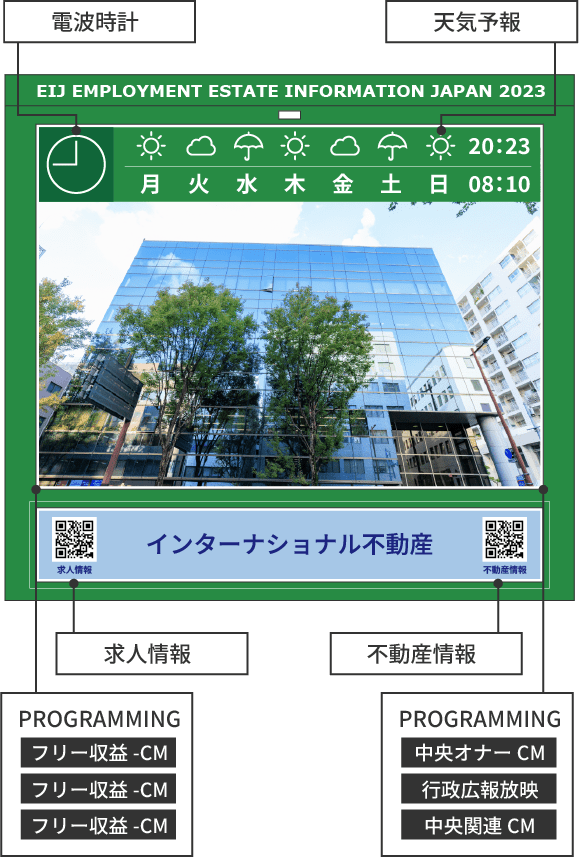 EIJBOXのデジタルサイネージは実用新案登録を取得。制作にあたり、株式会社三松との共同開発で先進技術を持って完成した情報ボックス上部に電波時計・天気予報をスライド映像、中央の大型ビジョンに有料CM映像、下部電照BOXの中央にはオナーサイネージ。左右メインの新たなビジネスコンテンツはQRコードからWeb・SNSへ誘導します。